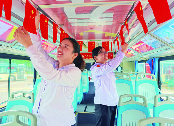在8路公交车上,志愿者们悬挂五星红旗,张贴“祝福祖国”的标语,“中国红”填满公交车厢。