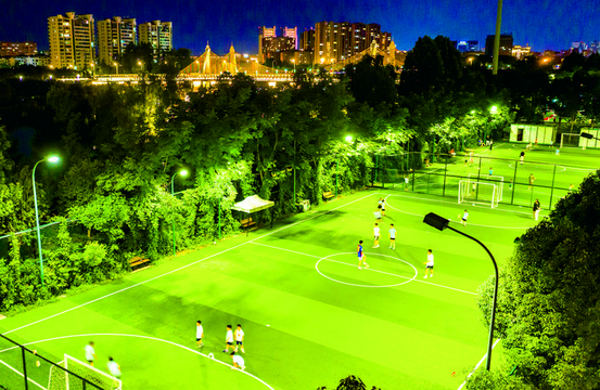 一江之隔的梦想公园足球场也是热闹非凡。足球爱好者穿上球鞋奔跑、呐喊,传球、射门动作娴熟,汗水浸湿球衣仍斗志昂扬,为城市夜生活增添一抹青春活力。