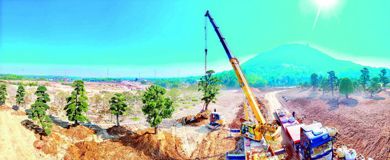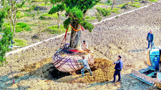11月21日,浙江省首批林苗一体化改革试点项目——金东区林苗一体化产业园项目现场机械轰鸣,挖掘机、吊车协同作业,工人们正有序开展绿植移栽工作。