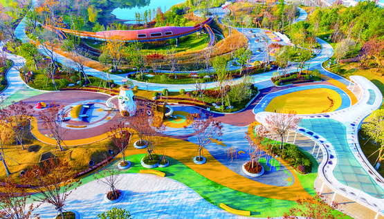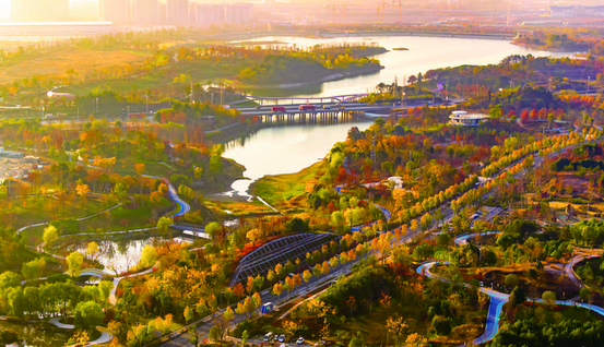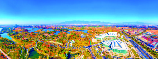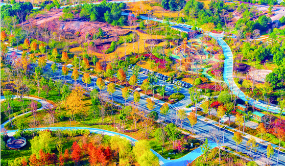 金色的晨光照拂,层林尽染的湖光山色,赋予“钢铁蝴蝶”云蝶中心腾飞的活力。从这里沿拱月路出发,沿途的梧桐勾勒“黄色”骨架,不远处的的栖凤桥越过湖面,如彩色丝带般增添一抹亮色。沿途的洛克公园被橙红的红杉、银杏等簇拥,鲜亮的蓝色场地趣味十足。晴翠丘低丘缓坡风貌浓郁,在岩坡上俯瞰,可见层林尽染、湖光一色、远山如黛,风光无限好。晨光映照下的湖面泛起金光,金义快速路上横畈大桥穿梭其间,汽车驶过,恰似画中游。另一侧的秋枫港里,乌桕、枫香、鸡爪槭正是最佳观赏期,与细长水巷形成水陆交映的红叶水廊。还可以沿云水汀缓行,水岸线蜿蜒伸展,倒影随波轻漾,岸边乌桕与水杉交错成廊,橙红浅黄层层晕染,与身后的现代建筑相呼应,自然与科技在此刻悄然交融,浑然一体……这个季节,还有启明谷、湖心岛、望湖堤、研学湾、学思潭、水漾泽,9大美好场景正以别出心裁的设计堆叠出最美金漪湖的点点滴滴。