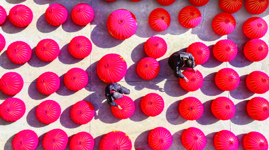 2026年1月12日,傅村镇贤永灯笼加工厂内,工人们正在制作、晾晒节庆红灯笼。穿钢丝、印图案、缝灯面、套灯架、拉金条等工序有条不紊。