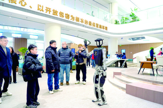 1月8日,区政务服务中心新址服务大厅内,人形机器人主动热情地与市民互动,工作人员细致引导办事流程,便捷高效的“一站式”政务服务新体验扑面而来。