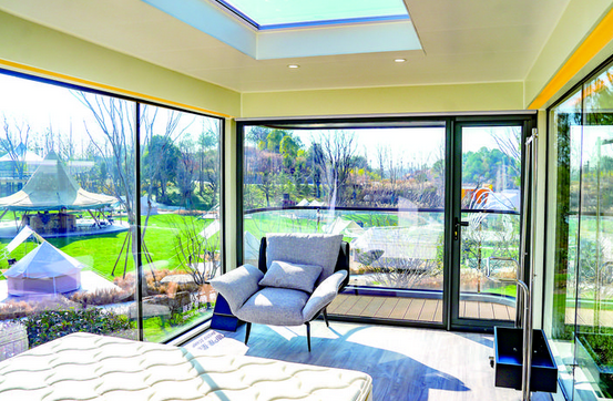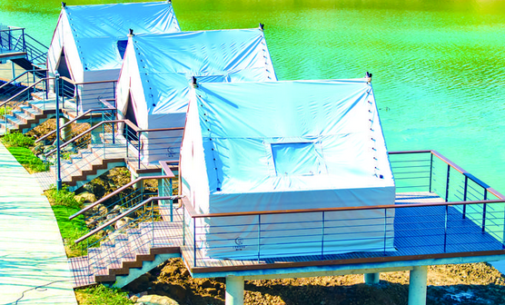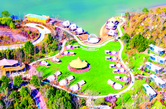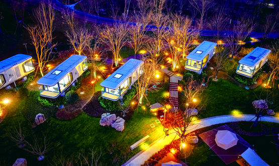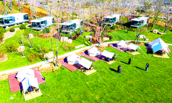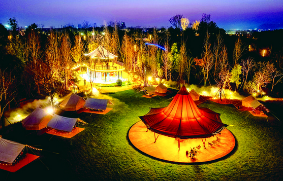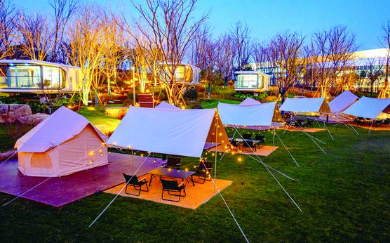 洛克营地总面积约1万平方米,依托金漪湖潋滟湖光构建核心景观,打造集栖居、探索、欢聚、静思于一体的沉浸式度假空间。营地内,开阔柔软的露营草坪作为“公共客厅”,日间可飞盘运动、瑜伽晨练、亲子嬉戏,夜间可围炉篝火、仰望星空,沉浸式感受露营本真之乐。童话感十足的休闲树屋藏于林间,让游客在鸟鸣树影中入眠、伴晨光湖景苏醒;设计感满满的林中太空舱可容纳2至4人,巨大观景窗模糊了室内外边界,为游客带来科技感与自然感兼具的住宿享受。