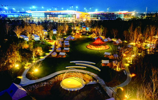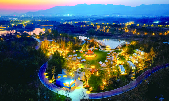 夜幕降临,金漪湖畔灯火璀璨,灯光勾勒出童话感十足的休闲树屋与科技感满满的林中太空舱轮廓,与湖面倒影交相辉映,随手一拍皆是美景。