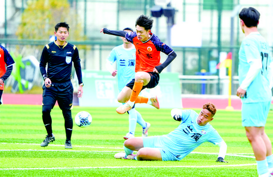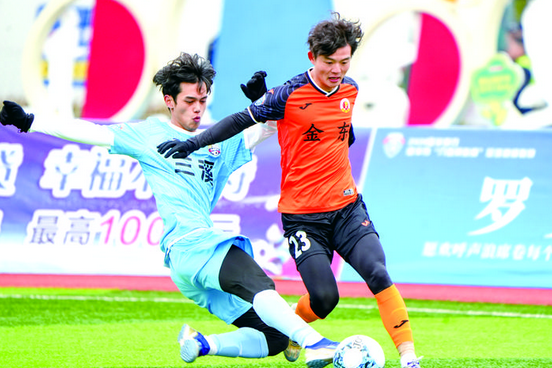 第9分钟,兰溪队还以颜色,趁金东防守未稳于禁区外突施冷箭,可惜皮球稍稍高出横梁。