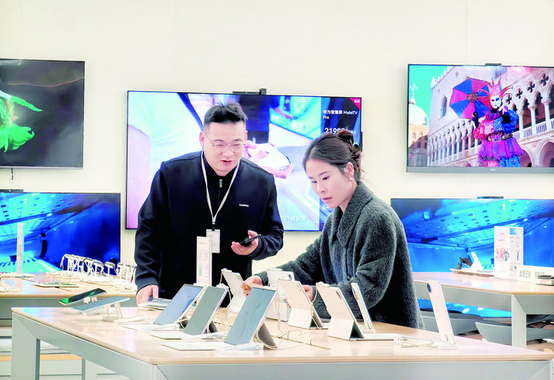 2月8日,记者在位于傅村镇的金义宝龙广场看到,多家数码产品店铺内人气十足,不少消费者驻足柜台前,详细咨询产品的性能参数及补贴政策,认真挑选心仪的机型,销售人员耐心讲解,一派热闹的景象。
