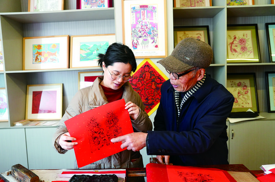 临近新年,位于塘雅镇的金华市木版年画博物馆里变得更加忙碌。年过七旬的非遗传承人黄根法早早来此赶制订单,他手拿棕刷游走于木质纹理之间,颜料随势浸润线版,洒金红纸覆盖其上,再用“趟子”轻轻刷印,线条渐次浮现,一对威风凛凛的门神跃然纸上。随着手中纸张的每一次掀起,年味也跟着浓厚起来。