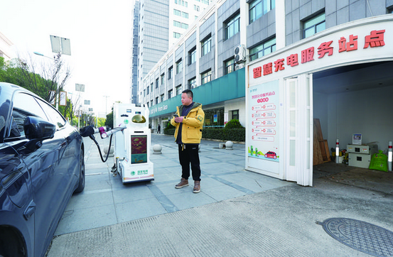 近日,在金东区光南充电站,不少新能源车主正通过扫码,使用国网金华金东供电分公司投放的智能充电机器人“小光”为车辆充电。