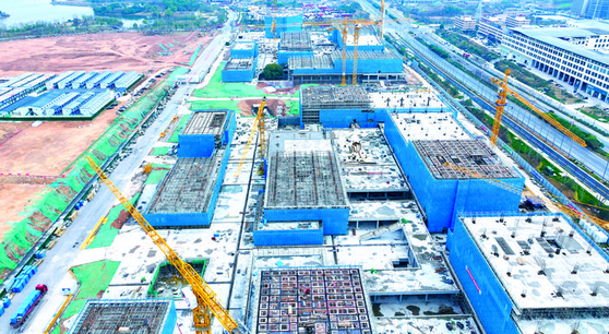 近日,在环金漪湖大孵化器集群项目建设现场,塔吊林立、机器轰鸣,几十名工人在准备混凝土浇筑工作。