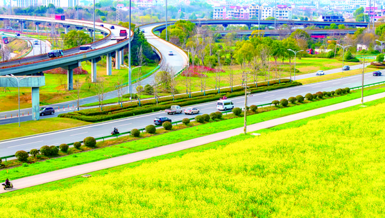 3月5日,二环东路至金义快速路东南侧的新鸿广场区块,大片油菜花盛放。花朵如彩锦铺展,与城市道路相映成趣,成为春日里一道亮眼的城市风景线。