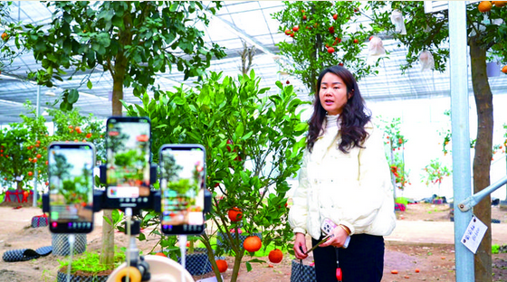 3月1日,在澧浦镇前余村“云上果园”共富工坊直播基地里,主播们正通过手机直播,带领客户“云”上逛果园,在线挑选心仪果树。