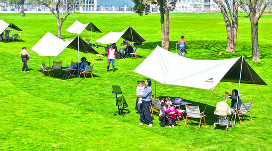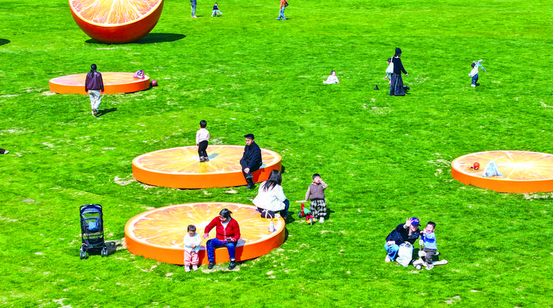 3月11日,在孝顺镇金满湖公园草坪加油区,巨型橘子艺术装置造型错落分布,鲜亮橙色与翠绿草地相映成趣。不少市民携家人前来打卡游玩露营,孩童在“橙瓣”座椅上嬉戏,大人们漫步其间,尽享春日暖阳与创意艺术带来的闲适时光。