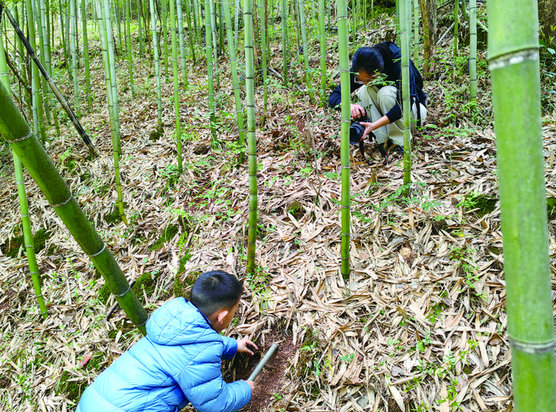 绕过一片桃林和油菜花田,竹林边缘的挖笋“大部队”已经忙开了。