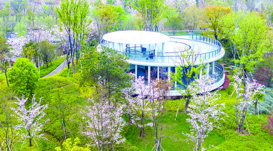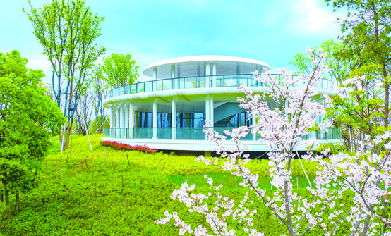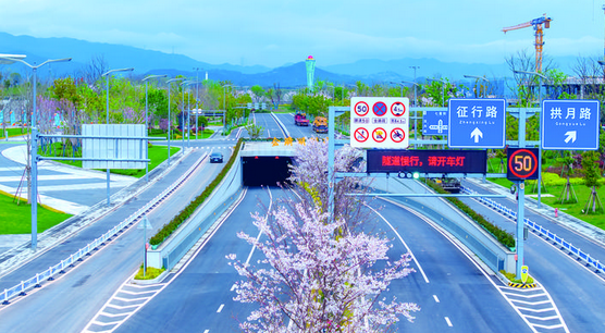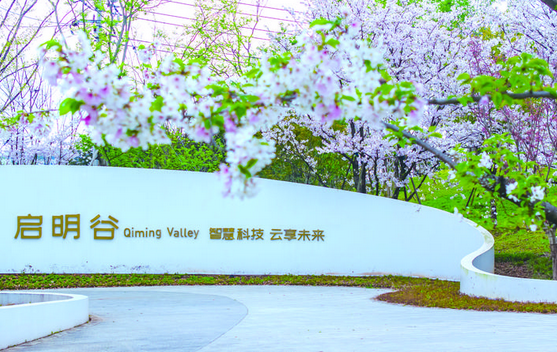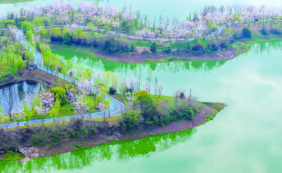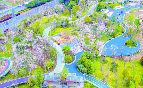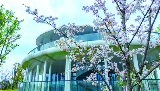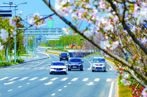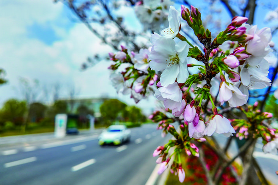 驱车穿行于金漪湖樱花大道,粉白樱花缀满枝头,与两侧车流相映成趣。车辆驶过,花瓣随风轻扬,一路繁花相送,途经金漪湖隧道,花影与光影交织,尽显春日灵动与浪漫。水漾泽、启明谷、智慧云谷等地樱花也正值盛花期。道路两旁、绿地之间,樱花树疏密有致,繁花簇拥枝头,远远望去,粉白花海与科创建筑错落交织,自然生态与智慧科技完美融合。