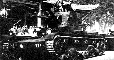 那场战役中,由我指挥一辆苏制T-26坦克。这种坦克战斗全重10.5吨,乘员3人,装备1门火炮和1挺机枪。虽然这是我第一次上战场,但在枪林弹雨中,我丝毫没有畏惧,开着坦克碾压日本人。